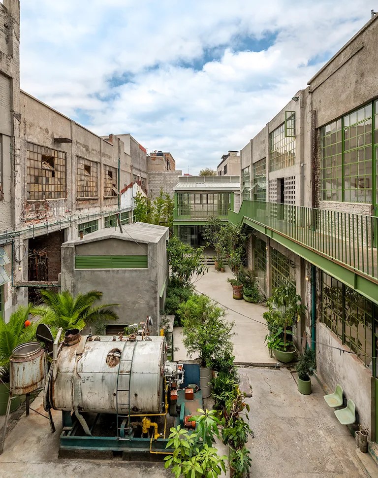 Lo primero que ves ya no es un complejo industrial, sino esta minúscula casita, que logra reducir la presencia imponente de los antiguos talleres textiles al no verse enteros y pasar a un segundo plano, dotando al patio de una escala sorprendentemente doméstica.