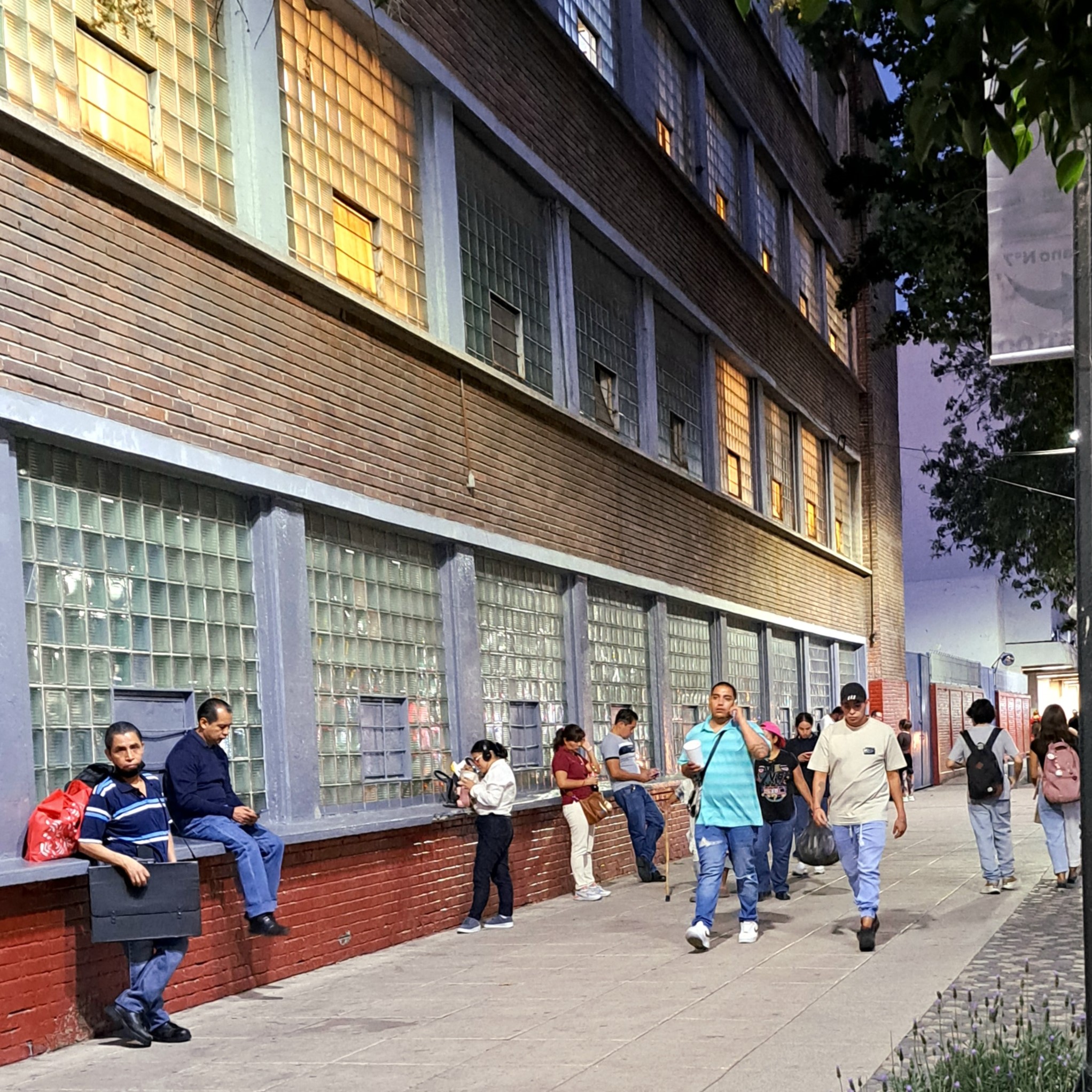Por eso reconforta encontrar edificios banales pero que -en su modestia- contribuyen considerablemente a activar el espacio público, como esta escuela de la Ribera de San Cosme que permite a la gente esperar la llegada de su transporte cómodamente apoyados en el larguísimo alféizar de sus ventanas de planta baja.