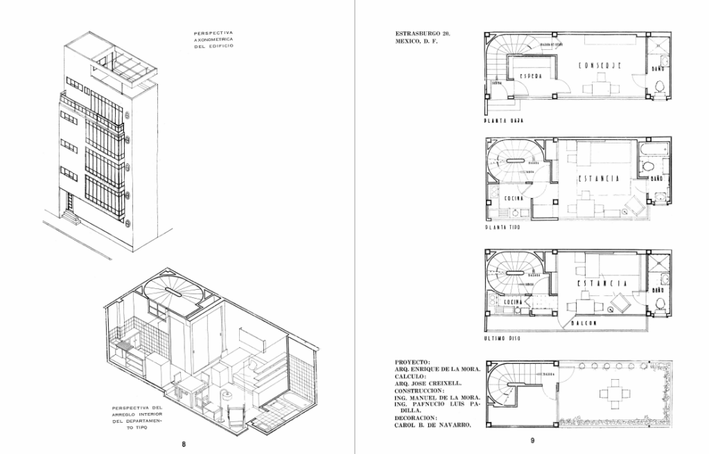 En un diminuto terreno de 27 m2 (9,2 por 3,2 metros) situado a una cuadra del Paseo de la Reforma, el arquitecto Enrique de la Mora proyectó un singular edificio de 4 apartamentos -uno por nivel- con el programa mínimo “para una persona o matrimonio”.